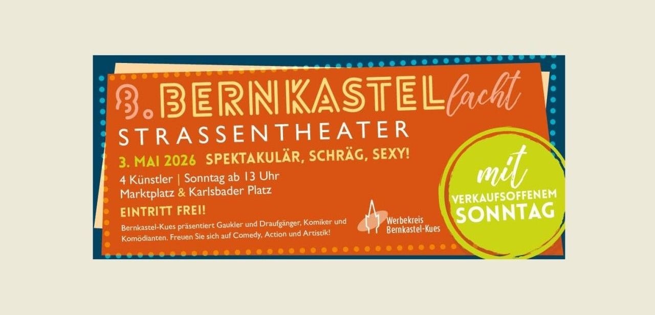 Am 3. Mai 2026 setzt der Werbekreis Bernkastel-Kues e.V. erstmalig auf die Kombination von verkaufsoffenem Sonntag und dem Straßentheater „Bernkastel lacht“. Ab 13 Uhr stehen die Geschäfte der Altstadt offen und präsentieren exklusive Aktionen. Parallel bringen Straßenkünstler Comedy, Tanz, Musik und Artistik direkt zu den Passanten. Das Event belebt das Stadtzentrum, fördert den Austausch zwischen Händlern und Publikum und schafft ein inspirierendes Rahmenprogramm für alle Besucher kostenfreien Sitzgelegenheiten und Bewirtung.